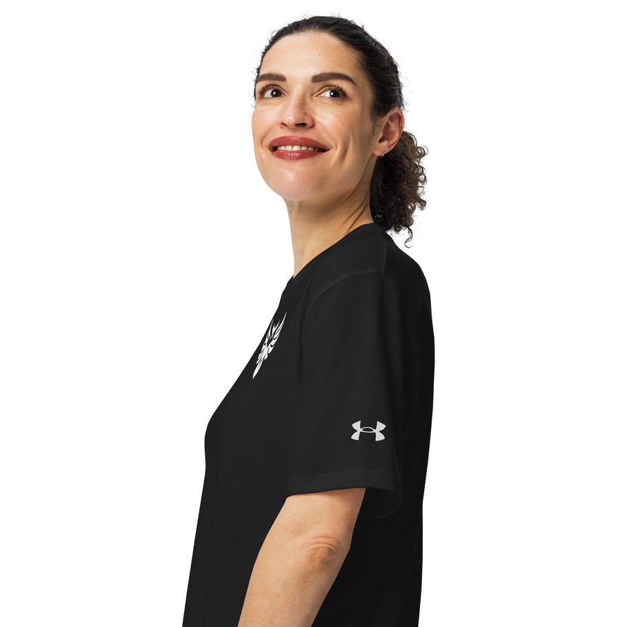 Elevate your workouts with the Under ArmourⓇ athletic t-shirt. Its light, quick-drying fabric makes it a must for running, hiking, or hitting the gym. • 60% cotton, 40% polyester • Fabric weight: 7.41 oz./yd.² (251.24 g/m²) • Unisex sizing, relaxed fit • Split hem • Heatseal Under ArmourⓇ logo • Fuller cut